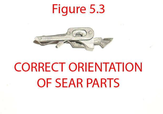 Ahora si usted quiere saber cómo estos bichos volver juntos y su orientación adecuada con los demás porque no presta atención, revisa Figura 5.3. Ah y solo lo sabe usted, la parte superior de la figura 5.3 es el extremo que va en el arma de fuego. Poner la interfaz de seguridad primero. Luego las otras dos partes juntas como una unidad. La parte cóncava (curva en) de la Asamblea se enfrenta hacia afuera, y que es donde entra la parte curva del martillo.