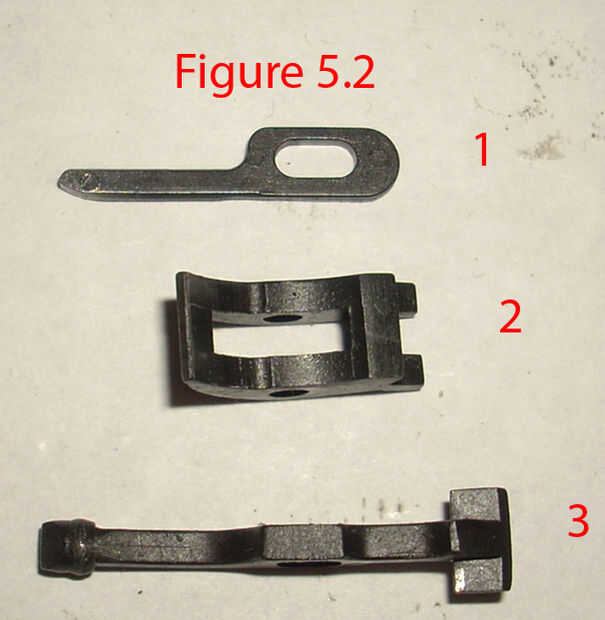 Ahora podemos ver en la figura 5.2 todas las tres piezas que acaba de quitar. La primera pieza no forma parte de la Asamblea para dorar, es lo que interactúa con el bloque de seguridad y perno de la leña de agarre. Si usted no recibe este bugger volver allí, o en correctamente. No podrás disparar tu arma. El gatillo y no pasará nada.