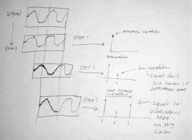 Lo que tenemos que hacer es cambiar la señal original a otro que pone de relieve la periodicidad de la señal original. Si es de hecho periódico, luego que se destacan en la nueva señal y entonces podemos medir de la manera habitual usando detección de pico o detección de cruce de cero.