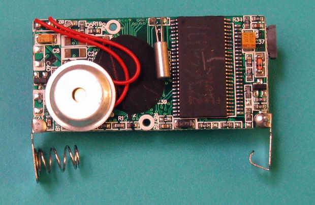 Después de que el caso se ha eliminado, desoldar el zumbador piezoeléctrico de la parte posterior. Este timbre está representado en la segunda foto de abajo.
