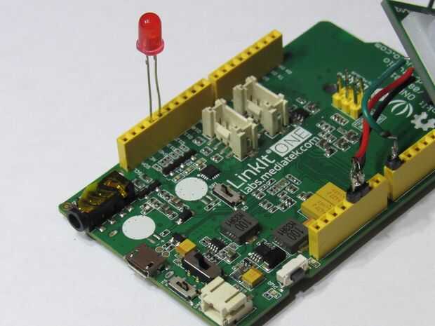 Usando cables de puente, cable de la patilla "señal" del sensor PIR para A0 en el tablero un Linkit, PIR "negativo" para el pin GND en Linkit uno, el PIR "positivo" al pin de 5v de Linkit uno, negativos de los LED a un "GND" en el ONE de Linkit y el positivo del LED al pin 13.