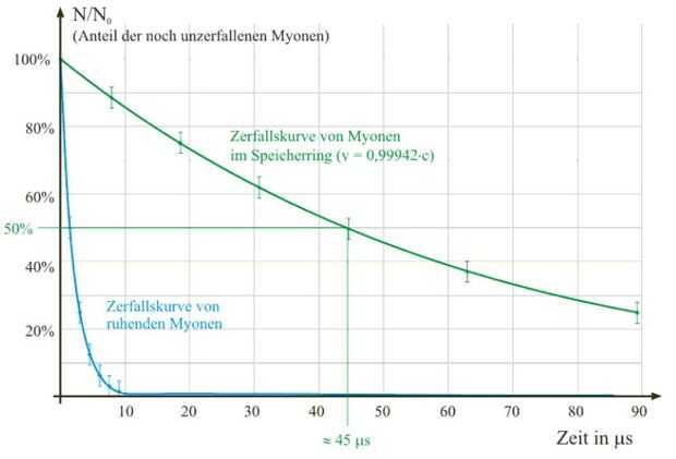 Muones son partículas elementales que pertenecen al grupo de los leptones (falso también llamado μ-mesón) con una masa de "medio" (207 veces más pesado que un electrón). Tienen un promedio de vida media de sólo 2,2 µsek. Para pasar a la atmósfera (20km) tarda más de 67 µsek incluso con la velocidad de la luz. Por lo tanto no deberían ser detectados muones en suelo, pero lo hacemos. La razón es, que Movimiento relojes van más lento. Para los muones rápidos pasa el tiempo más lento y por lo tanto pueden llegar a la tierra. Esto puede verse en los dos gráficos de decaimiento diferentes. Decaimiento de muones en electrones (positrones) y neutrinos.