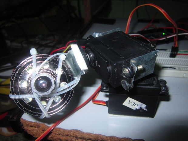 http://aleksandarkrstikj.com/Tracking-a-Ball-and-rotating-Camera-with-OpenCV-and-Arduino/