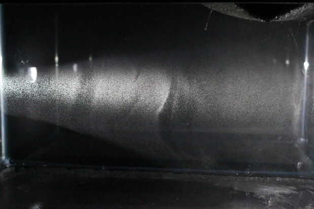 Ahora oscurecer la habitación y enciende la cámara de niebla con su fuente de luz. Cubrí todo pero una de las caras de la pecera con cartulina negra para hacer más fácil para los rayos cósmicos a filmar, pero no es necesaria. Casi de inmediato se debe ver una nube de alcohol vapor comience a llover abajo y después de unos 10 min forman un estupendo saturado vapor de alcohol. Ahora podrá observar algunos senderos de vapor hacia la parte inferior de la cámara de niebla.