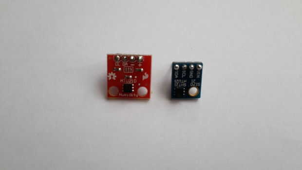 Tengo unos módulos aquí. Tienen diferentes colores pero el sensor es realmente absolutamente la misma en ambos módulos. Tenga en cuenta que la otra diferencia física es la posición de las líneas de datos y reloj. Voy a utilizar el módulo de HTU21D azul para el resto del tutorial.