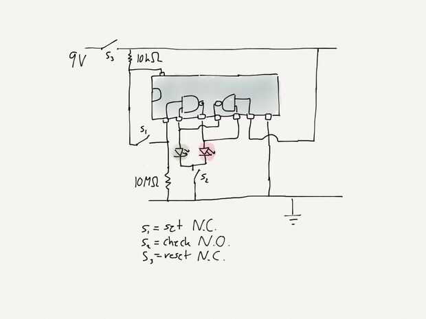 Utilizamos dos de las puertas NAND en la IC para crear un cierre; un simple recuerdo que recordará si el interruptor s1 se ha abierto o no.