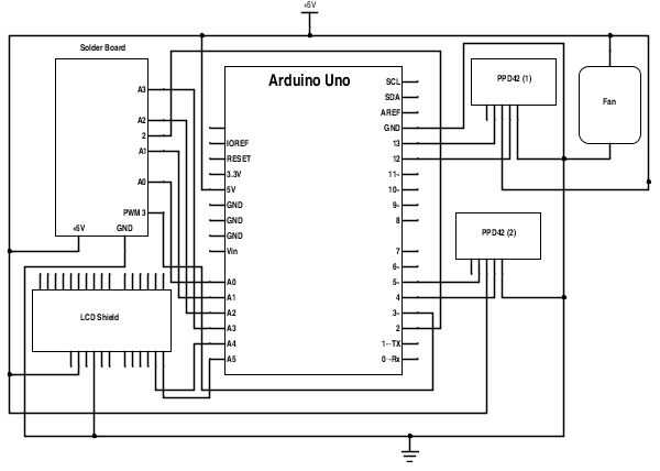El diagrama del circuito anterior es la totalidad de esta obra de detector de contaminación. Un esquema detallado para la Junta de soldadura sigue más adelante. Tenga en cuenta que puede cambiar la mayoría de los puertos digitales y puertos analógicos que sensores en caso de que deba hacerlo (por cualquier motivo); Esto requerirá sólo que editar el código que hemos proporcionado a cuenta de estos cambios.