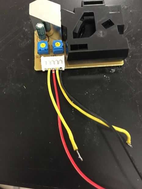 Cada Detector Shinyei tiene dos salidas de señal: para pequeñas partículas (cable amarillo a la izquierda en la foto de arriba) y partículas más grandes. Estas señales son conectar salida las entradas digitales de la Ardiuno. El detector debe ser accionado por el suministro de + 5V y tierra a los puertos en el detector. Ver el diagrama del circuito general para más detalles.