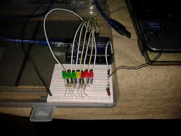 Me set-to cambiar la resistencia de la luz dependiente con un resistor de alto valor y un trozo de alambre como antena/antena. Después de un poco de tuning funcionaba bastante bien. I sustituirá cuatro de los LED rojos con tres verde y uno amarillo. El Arduino detecta el voltaje en pin A5 (el análogo entrada pin más cercano al final!!!!) y el más la tensión de los LEDs más luz.
