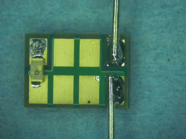 Coloque el LED con el ánodo (parte positiva) en el pin 1 y el cátodo (lado negativo) en el pin 8 y la soldadura con cuidado. Para aquellos no familiarizados con los LED, el símbolo del triángulo del diodo debe apuntar con el conector de tierra del módulo (pin 8). Su cosechadora de microondas final debería parecerse a la figura 2