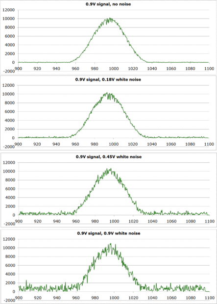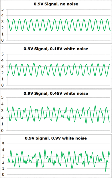 La primera figura muestra la respuesta del algoritmo cuando una señal sinusoidal es acompañada por aumento de niveles de ruido blanco. La primera parcela es sin ruido presente, y los diagramas siguientes muestran la respuesta cuando la amplitud del ruido es 20%, 50% y 100% mayor que la amplitud de la señal. Incluso con una cantidad significativa de ruido blanco con la señal, se puede todavía ser confiablemente detectado.
