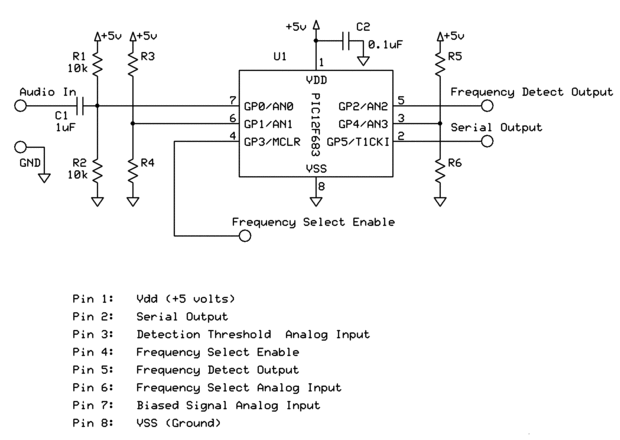 R5 y R6 forman un divisor de voltaje que se utiliza para establecer el umbral de detección. Esto permite al usuario seleccionar la magnitud de la salida del algoritmo que es necesaria para que el programa Active la salida alta. El procesador lee el voltaje en el pin de umbral de detección y el valor utiliza para determinar el umbral de detección.