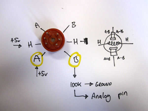 PIN A está conectado al pin de 5V. Y el pasador B se conecte al Pin GND y el Pin A0 como se muestra en las fotos.