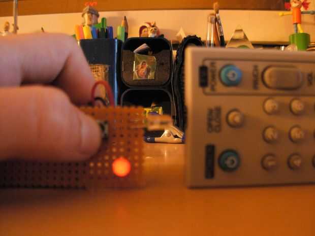 Tomar cualquier mando a distancia. Poner fototransistor cerca del IR LED del control remoto. Empuje el interruptor, manténgalo y pulse cualquier botón del mando a distancia TV, mantenerla. El LED del detector comenzará a parpadear.