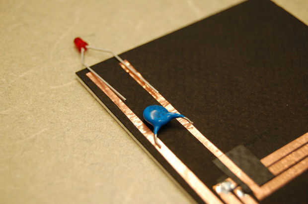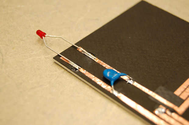 A continuación, añadimos el condensador (82 pF) y el LED corriente baja a la etiqueta como se muestra en la figura 3. Se conectan en paralelo. Nosotros también la soldadura de estos dos componentes al cobre de la cinta (ver figura 4).