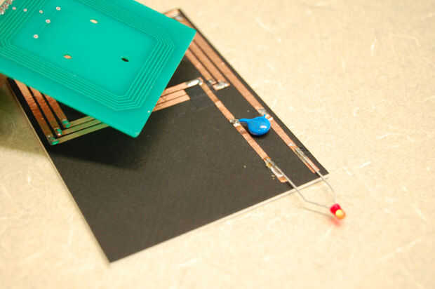 Con estos sencillos pasos, nuestro detector de lector RFID se acaba! Trayendo nuestro detector de bricolaje RFID cerca de un lector RFID (como se muestra en la figura 5), se enciende el LED conectado. Con el Sonmicro hardware lector la distancia y el lector tiene que ser por debajo de 8-10 cm; sin embargo, se dispone de lectores RFID con un campo electromagnético más fuerte y por lo tanto un máximo mayor distancia de lectura.