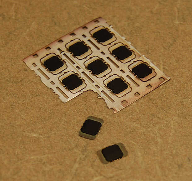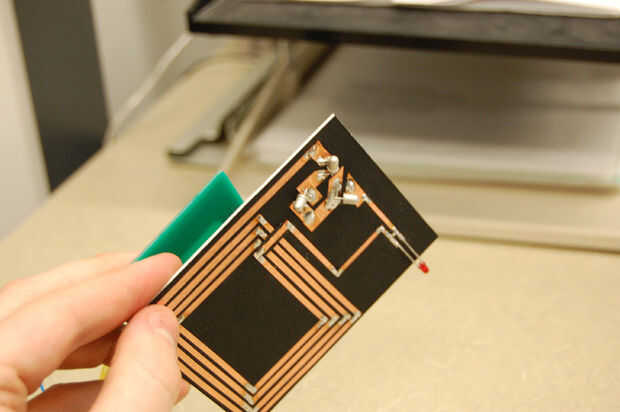 Ahora podemos reemplazar el capacitor conectado y el LED de nuestra etiqueta con un chip RFID (por ejemplo, el MIFARE 1k se muestra en la figura 7). Haciendo esto, la actividad de nuestra etiqueta no es visible a través del LED, pero la etiqueta es legible por el lector de RFID y responde con el número ID del chip.