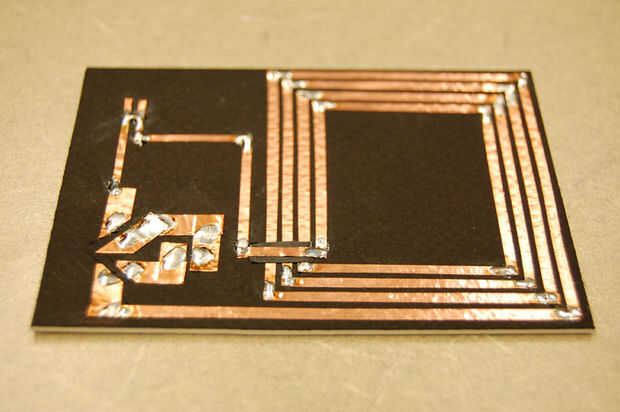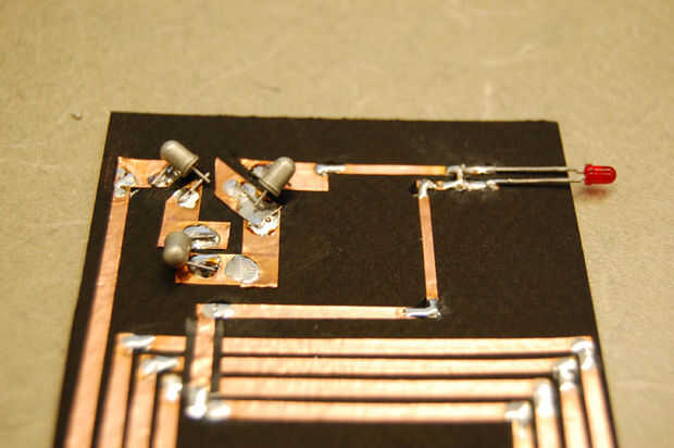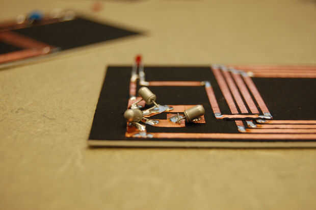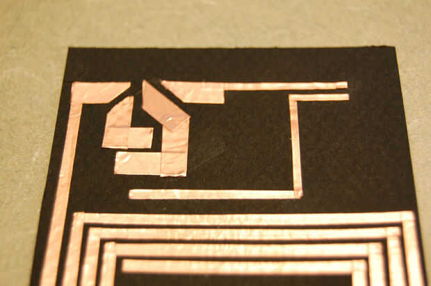 A continuación, añadimos las conexiones de la cinta de cobre adicional a la etiqueta, como se muestra en la figura 1. Estas conexiones nos permiten conectar tres interruptores de inclinación, un condensador y el LED a la antena. Otra vez, todas las conexiones de la cinta de cobre se sueldan juntos.