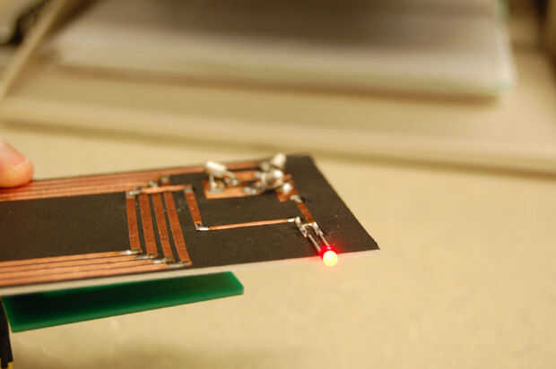 Una vez más, también añadimos un LED y un condensador a la antena como se muestra en la figura 3 (utilizamos un factor de forma diferente del condensador aquí sólo para ilustrar las opciones alternativas).