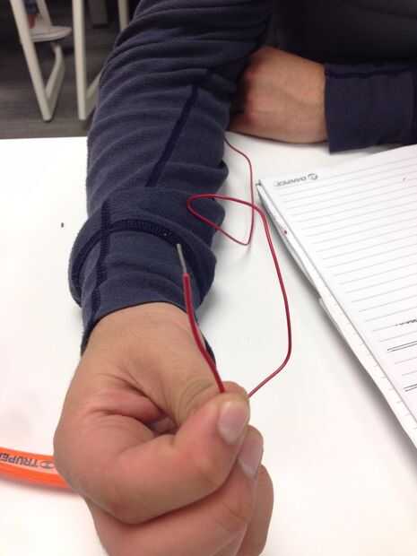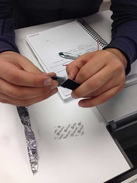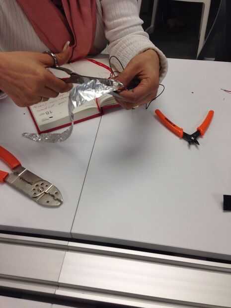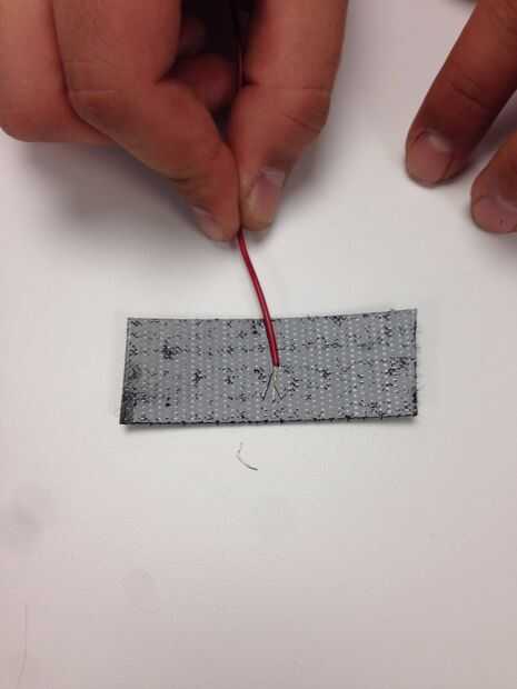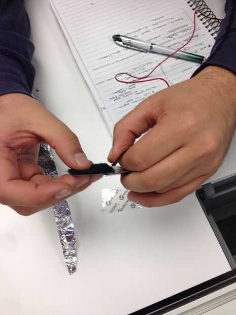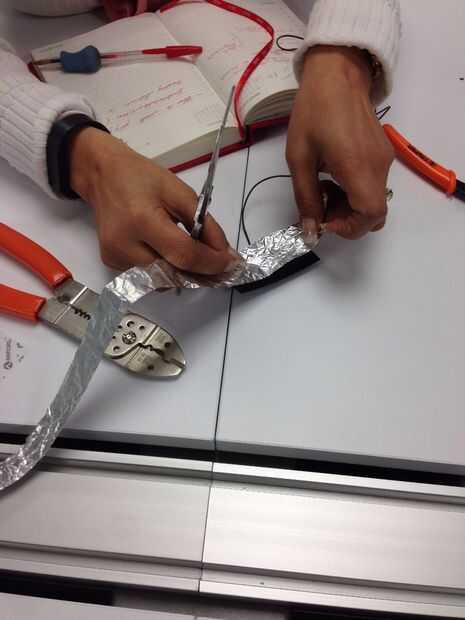 Para hacer los electrodos cortados un pedazo de velcro autoadherible de unos 5 cm de largo y 1-2 de ancho. Pelamos el cable con la pelacables y pegamos el extremos pelado a la parte adherible del velcro. Ahora pegamos el papel aluminio sobre la toda el área adherible del velcho cómo vemos en la imagen 4. Ahora tenemos un velcro con el aluminio y falta solo agregrar un pedazo pequeño de 1 cm de largo de velcro duro (la otra parte del velcro es la parte suave). No. este pedazo pequeño de velcro duro va un el servir para enrollar el electrodo en dedo y fijarlo.