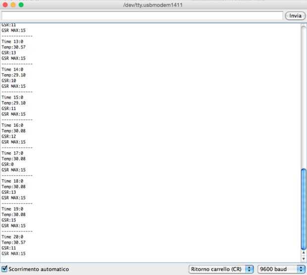Puede abrir el puerto serie del ordenador y leer el valor en la pantalla. Después de 1 segundo el valor se actualiza. Puede crear el informe de reunión de toda medida. Como en la foto.