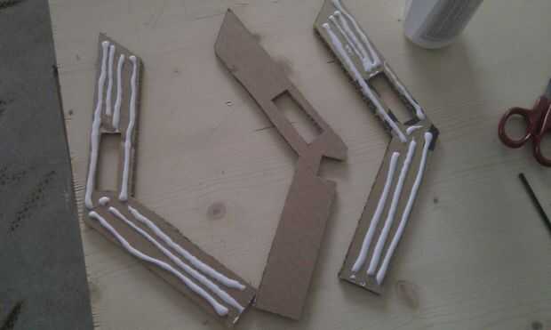 En primer lugar, hice un boceto. No había ninguna medición. Primero hice tres piezas que va a terminar un mango. Segunda tarea era recortar las aberturas para las pilas e interruptor. Entonces pegué voluntad juntos mango madera pegamento y dejar secar durante 12 horas (toda la noche). Cuando el pegamento se haya secado había perforado un agujero en la sección donde el interruptor será. Ese agujero es para que cables pasar.