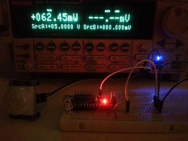 * No detectado movimiento por sensor PIR - exterior LED en pin D13 está apagado: - 12.87milliAmp / 62.45 mWatt