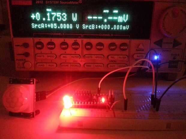 * Movimiento detectado por el sensor PIR - exterior LED en pin D13 es encendida: - 36.55 miliamperios / 175 mWatt