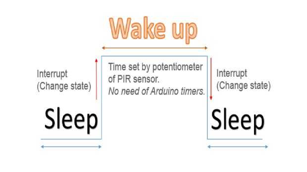 Una vez, es el paso del tiempo, PIR salida otra vez vuelve al bajo de alta, esta señal de borde cae levanta otra interrupción, poner arduino en hibernación una vez más.