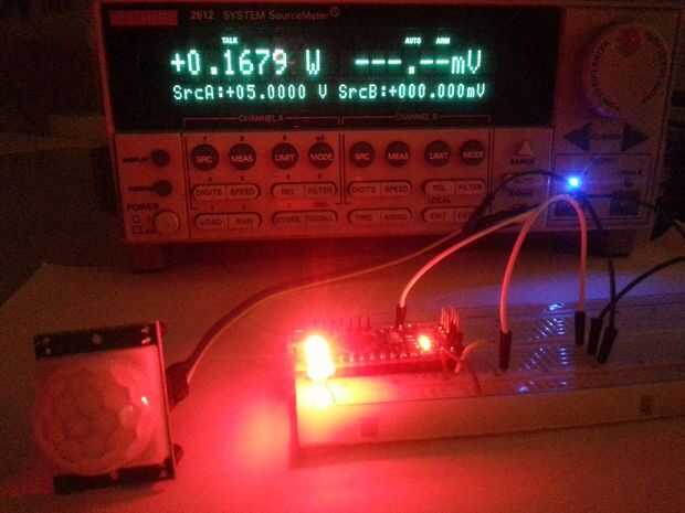 * Movimiento detectado por PIR - exterior LED en pin D13 se activa (despierta): - 32 miliamperes / 167mWatt