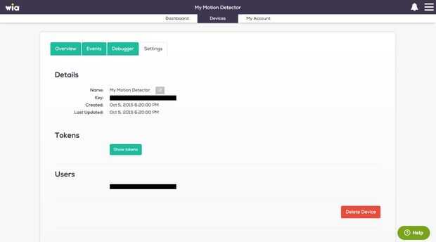 Crear un dispositivo en el salpicadero de Wia (https://dashboard.wia.io). Tome nota de la ficha dispositivo. Usted puede encontrar en ajustes de dispositivo.