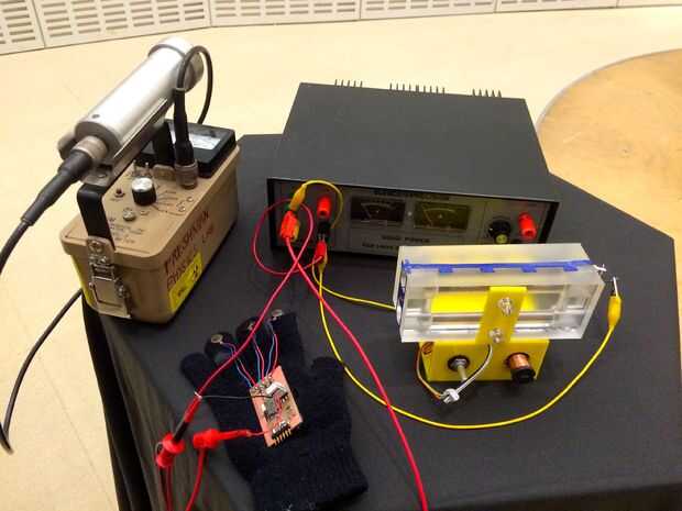En este tutorial, usted aprenderá cómo construir un dispositivo que le permite sentir la radiación en las inmediaciones en el alcance de su mano, y, si bien sintonizada, rayos cósmicos, pasando por las manos. Se construirá a partir sólo con tubos Geiger Muller, los componentes electrónicos estándar y RFDuinos. Los pasos básicos son crear una fuente de alto voltaje en para suspender los tubos, proceso de pulsos de los tubos y darles de comer en un RFduino y luego usar biblioteca GZL de RFduino a eventos de radio para un guante con motores de vibración unida a la punta de los dedos. (RFDuino también es muy fácil de leer datos en una aplicación para el iPhone, si te apetece ir más lejos). Si le gustaría leer a través de un diario que mantenía mientras trabajaba en el proyecto, está disponible aquí