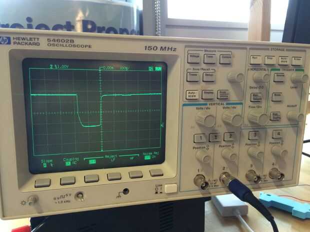 Si todo va bien, debería poder ver los pulsos a la salida del tubo en el osciloscopio como en la imagen de arriba. Estos pulsos deberían mirar bastante limpios y representan hits!
