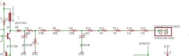 Compruebe a continuación, cuál es el grado de resistencia del ánodo para el tubo. Para el tubo de SBM20, se recomienda 20 MegaOhms. Esta resistencia limita la corriente a través del tubo y por lo tanto es generalmente muy alto. Que he dividido mi resistencia entre 4 resistencias de 250K (R7, R8, R9, R10) para limitar la caída de voltaje a través de cada uno (ya que mis resistencias no son clasificados para altos voltajes). Si usted tiene resistores de alto voltaje se puede usar una sola. R11 es opcional y se entiende por seguridad) (Realmente he acabado quitando minas en el extremo). Cuando se cambia apagado, una tensión grande permanecerá almacenada en el C2/C3. Goteará fuera lentamente basados en las propiedades de salida de la tapa, pero R11 acelerará drásticamente la fuga. En el lado positivo, esto significa que hay menos riesgo de lesión de choque si fueras a tocar el circuito unos segundos después de apagar la alimentación. En el lado negativo, esta resistencia reduce la tensión almacenada en el condensador. Usted podría elegir un valor significativamente mayor que 1M, si elige incluir como precaución de seguridad. No estoy seguro del propósito de la R6, pero fue incluido en mi esquema de referencia (citado en el paso anterior) así que incluido también. A continuación incluyo dos conectores SMD 2 x 2 separados para colocar en el ánodo y el cátodo del tubo de mi: