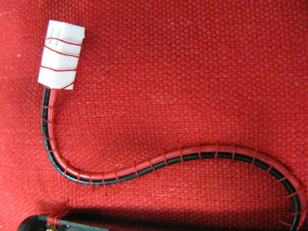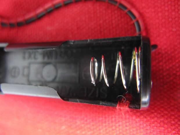 coser batería 1" del borde izquierdo de la tela. Asegure con el hilo de dos orificios en el plástico.