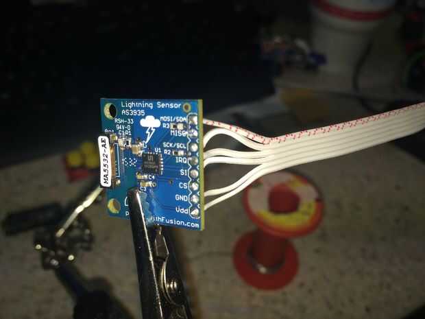 El sensor de rayos tiene la capacidad de utilizar el SPI o I2C. Después de alguna experimentación encontré que por algún motivo tener ambos conectados a través de SPI era problemática. La detección del relámpago no era confiable y había problemas de ruido entre la pantalla y el sensor de rayo. Cambiar el Sensor encima a I2C aclarado los problemas.