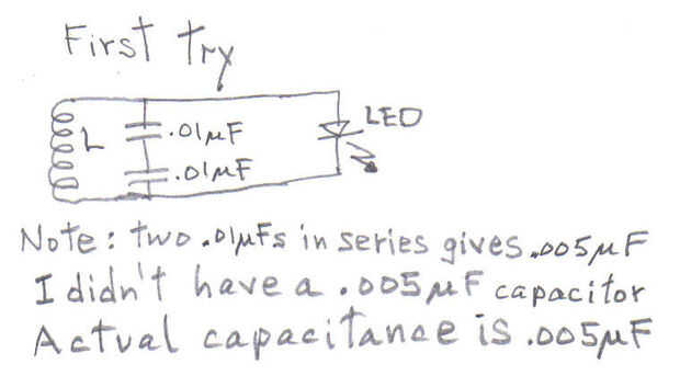 Le enchufamos 330 uH en la fórmula anterior y el resultado sugirió que necesitaba un.005 uF capacitor para que coincida con mi 330 uH la bobina para que la bobina - combinación de condensador sería "resonar" a 125 kHz, permitiendo poder suficiente para llegar a y el LED de la luz.