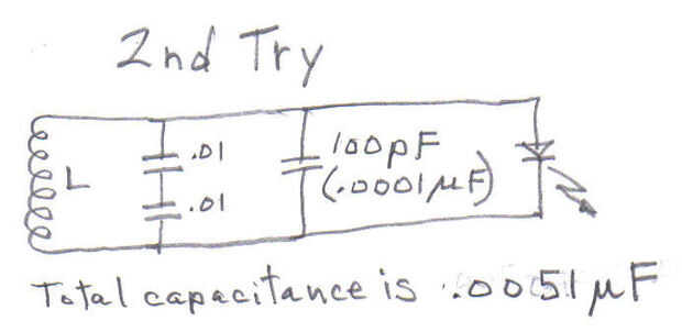 Después breadboarding la bobina, LED y dos.01 uF condensadores conectados en serie y luego conectado en paralelo con el LED (para dar una capacidad neta de.005 uF (5000 FP), enciende mi pequeño lector y cuando me mudé la bobina 4 pulgadas del lector, el LED comenzó a brillar. El LED brillado intensamente muy brillantemente cuando sostuve la bobina alrededor de media pulgada desde el lector. Luego agregar un capacitor de 100 pF (.0001 uF) en paralelo al circuito. Esto aumentó aún más la gama. Y entonces encontré que añadir aún otro pf 100 condensador (total de pF dos 100 condensadores) en paralelo con todo lo causó una mejora más en gama. Pero añadiendo un tercer condensador de 100 pf disminuyó a la gama. Así que con mi bobina, parecía 5200 pf de capacitancia era lo mejor para la bobina que tenía (ver 3ª prueba esquema).