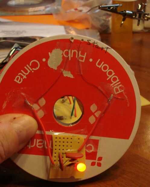 La secuencia de fotos muestra cómo el LED pasa de no ser visible a más brillante y más brillante como la bobina se coloca más cerca del lector de RFID.