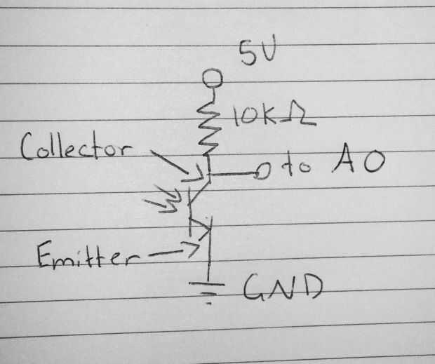 Simplemente conecte el fototransistor y el Resistor en serie. Conectar el emisor del fototransistor (pata larga) a GND y el pin del colector (pata corta) a la resistencia que conectamos al pin de 5v de Arduino.