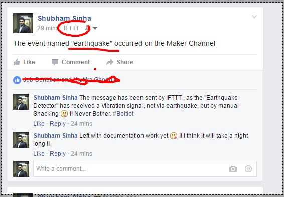 Shubham Sinha y Ankit Vyas(students of IIT Guwahati) he hecho un Detector sísmico. Fue la primera experiencia trabajando con la plataforma de perno-IOT. Es muy emocionante. Inicialmente trabajé con Arduino, y era bastante simples, pero aquí ya que inolves script de java, así codificación parecía difícil, ya que soy nuevo en Java Script, pero en general fue una experiencia impresionante.