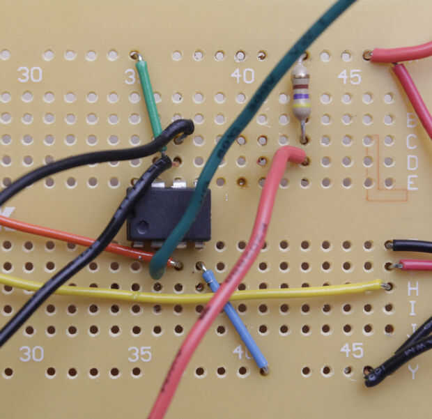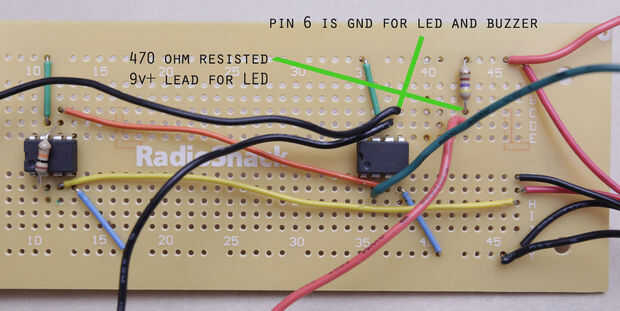 Funcionó un resistor de 470 Ohm de 9V + carril y había conectado ese resistor al positivo del LED. Cable negativo de tanto el LED y Piezo zumbador ejecutar al pin de salida (6) de la derecha del IC.