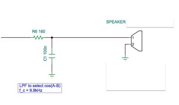 Selecciona la señal deseada, que cae en la gama de audio. No un necesario paso si los altavoces pueden manejar ruido de alta frecuencia, pero una buena medida de precaución. Optamos por utilizar un pasivo RC filtro porque era suficiente. Hubo más de una década de frecuencia entre el ruido de la competencia (a ~ 75kHz) y la señal (a ~ 5kHz), por lo que el ruido se atenúa por acerca de 20db.