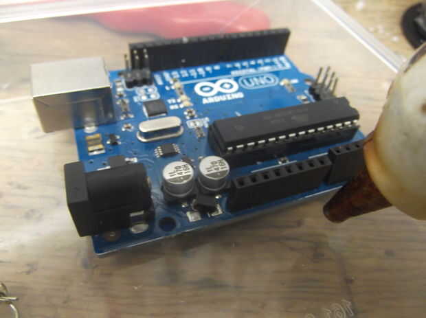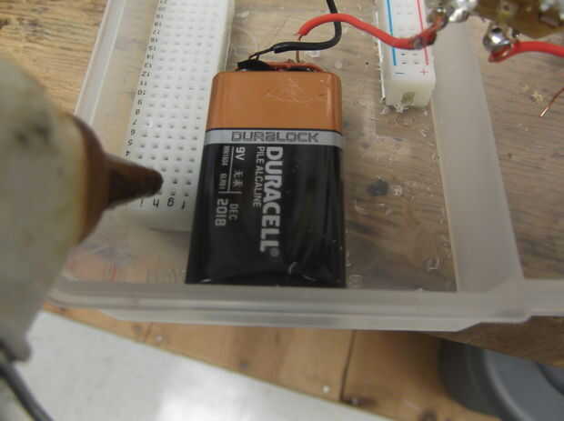 Caliente-derrita el pegamento tira de la batería de 9 voltios, mini breadboard, Arduino y distribución de energía en su caja.