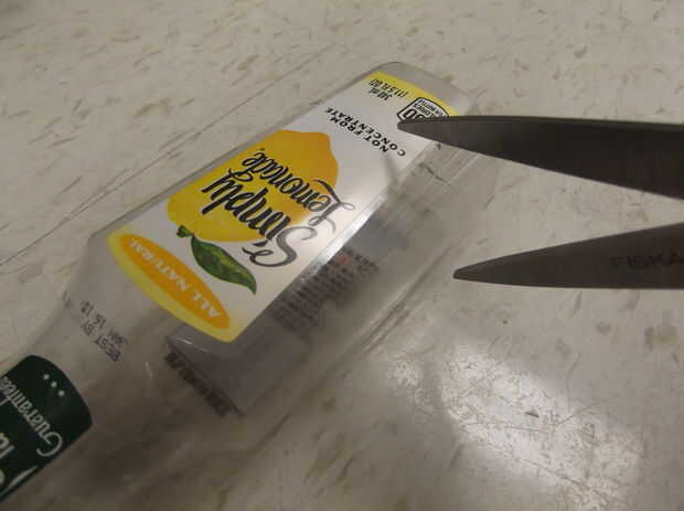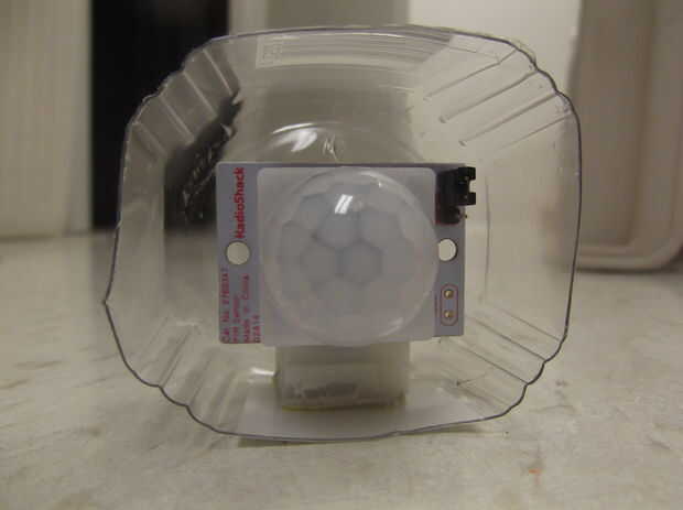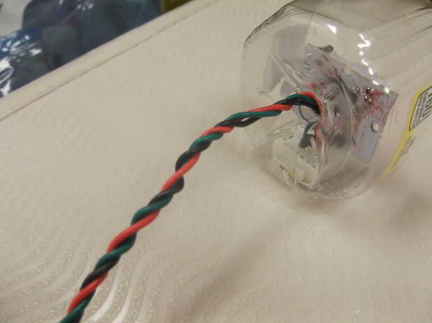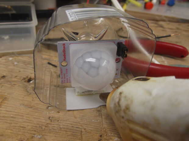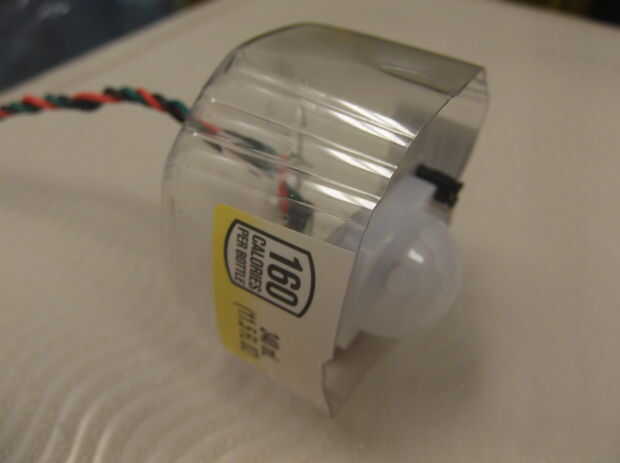 Para la caja de sensor PIR, usaremos una botella mini simplemente limonada. Cortar la parte inferior con unas tijeras, luego taladre un agujero de tamaño mediano en la parte posterior para cables. Ajustar su pequeña protoboard y sensor PIR dentro, luego pegue la placa interior. Luego enrollados los cables para un agradable efecto resistente.