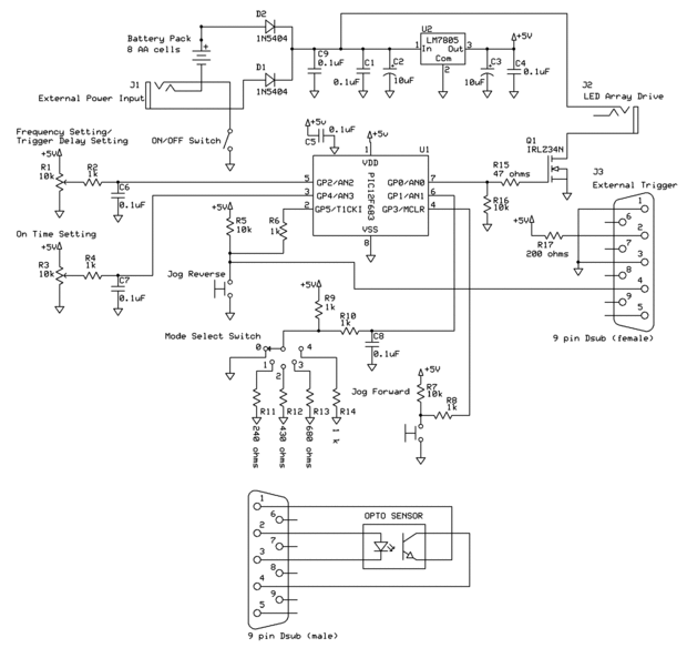 La entrada reversa jog también se utiliza como la entrada del disparador en el modo de flash activada. Esta conexión se trae hacia fuera a través de un conector D-sub de 9 pines (J3) de interfaz para sensores externos. Cualquier sensor u otro circuito externo, como un interruptor óptico o un interruptor de efecto Hall, que puede tirar esta línea bajo tierra, puede utilizarse para activar el flash. También dispone de una salida de corriente limitada en el conector D-sub, para alimentar un LED infrarrojo si se utiliza un tipo de interrupción óptico del interruptor. Esta línea está conectada a + 5V a través de una resistencia de 200 ohm. Consulte el esquema para ver las señales en el D-sub y cómo conectar a la interfaz para un interruptor óptico interrupción. Se muestra un ejemplo de un sensor óptico de IR en la parte inferior del esquema.
