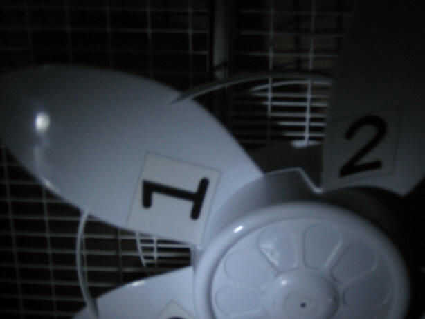 Para poner de relieve algunos de los efectos de strobe, os adjunto una etiqueta con un número a cada una de las cinco láminas del ventilador. Parpadea la luz estroboscópica a una tasa igual a la velocidad de rotación o una fracción del entero de la misma, los números parecen soporte todavía junto a las aspas del ventilador. En las frecuencias donde es una hoja diferente en la misma posición como la anterior uno cada vez la luz estroboscópica se activa, las hojas parecen detenerse pero los números a contar hacia arriba o hacia abajo.