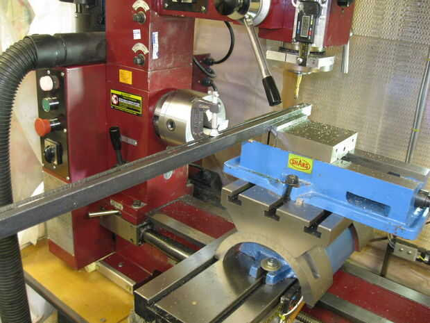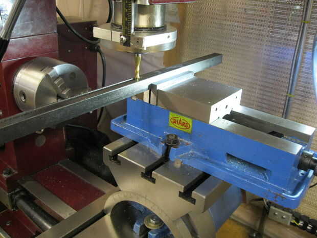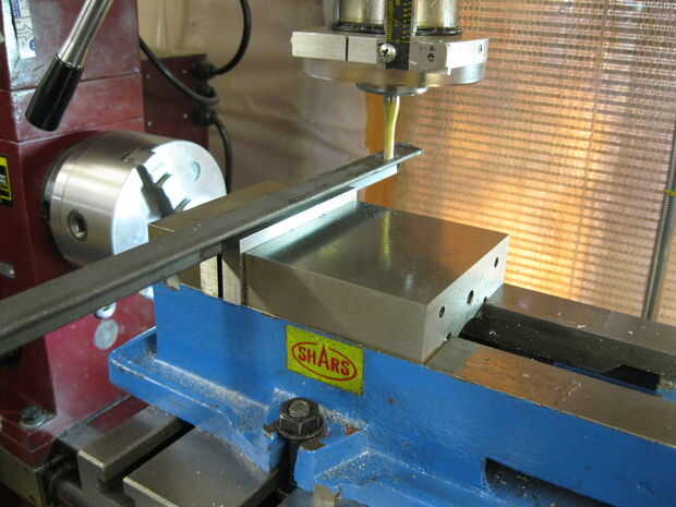Usé una fresadora para crear el hierro de ángulo ranurado. Este es por lejos la forma más rápida para cortar la ranura. Si utilizas este método utilice un centro de corte 1/4" molino de extremo (desbaste está bien). Hundir el orificio inicial y utilizar abundante aceite e introduzca lentamente la parte en la broca. Ver el borde libre de la corte, si empieza a vibrar utilice una abrazadera para conectarlo al cuerpo principal (como se muestra) para mantener el espacio y eliminar la vibración.