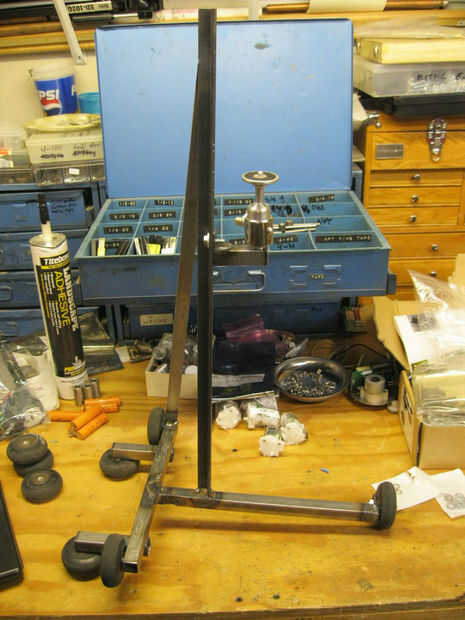 Perno del conjunto de montaje de la cámara al soporte vertical, mediante un 1/4"-20 x 3/4" tornillo y arandela plana. La cabeza del perno y la arandela plana deben estar en el interior del hierro de ángulo de soporte vertical y el montaje de cámara en el exterior hacia la tercera rueda en la base del T. Cuando apriete el perno de ajuste de cámara montaje Asegúrese de que el piso es bar contra el lado del soporte vertical y el fino borde libre del soporte vertical bajo la arandela plana. El piso bar evita que la cámara gire fuera de escuadra ajustado mientras la lavadora y el borde fino pone fuerza incluso en la superficie de sujeción.