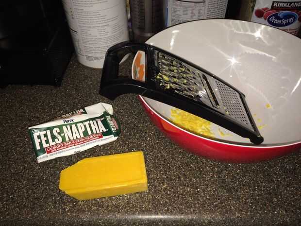 Usando el rallador de queso, ralla Fels nafta jabón para la ropa en un recipiente aparte hasta que todas las 4 barras son ralladas en finas astillas. Este paso llevará más tiempo, así que asegúrese de dejar de lado unos 15 minutos para rallar completamente cada barra de jabón.